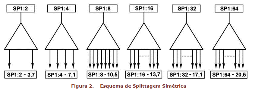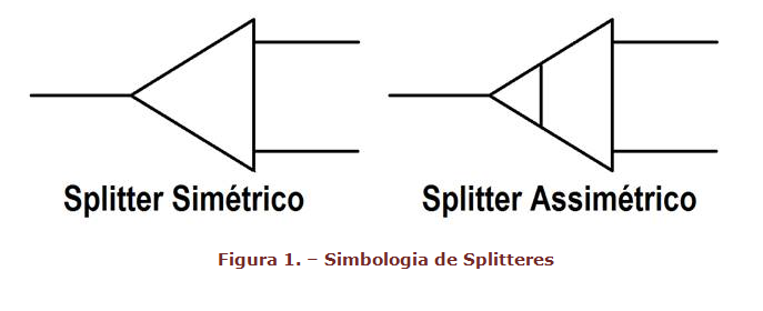 A simbologia usada para representar splitteres simétricos e assimétricos é um triângulo, diferenciando-se um do outro por uma pequena linha.