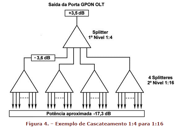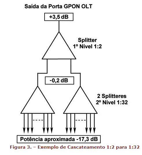 Entre os casos mais comuns de associação de Splitteres de primeiro e segundo níveis, temos os casos indicados, como exemplo nas figuras seguintes para as associações de Splitter 1:2 para 1:32, 1:4 para 1:16 e 1:8 para 1:8, respectivamente.
