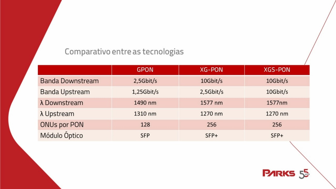 Na tabela a seguir pode ser conferido as principais diferenças entre GPON e XGSPON: