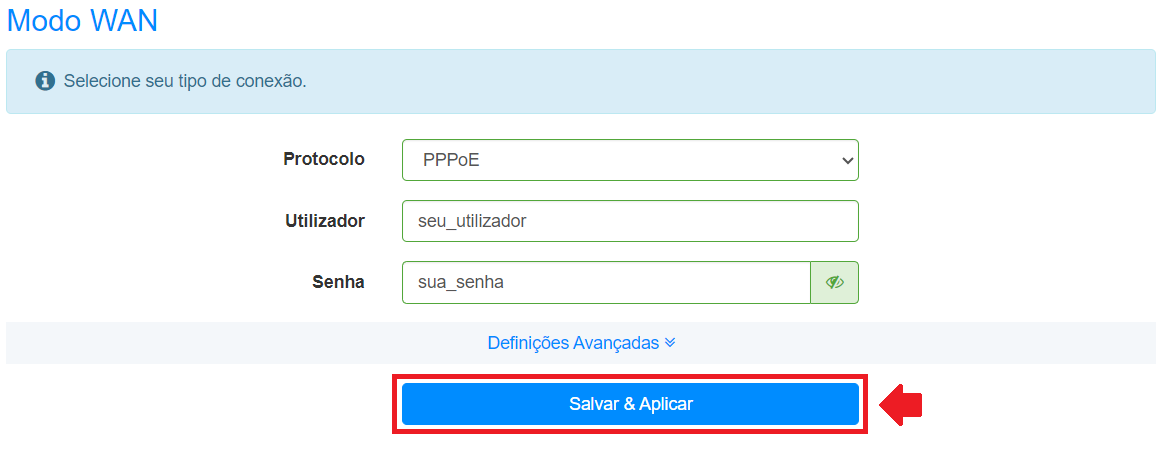 4. Após selecionar o Protocolo PPPoE , basta preencher os campos utilizador e senha com os dados de sua preferência. Para salvar as alterações feitas, prossiga clicando no botão Salvar & Aplicar, como na imagem a seguir:
