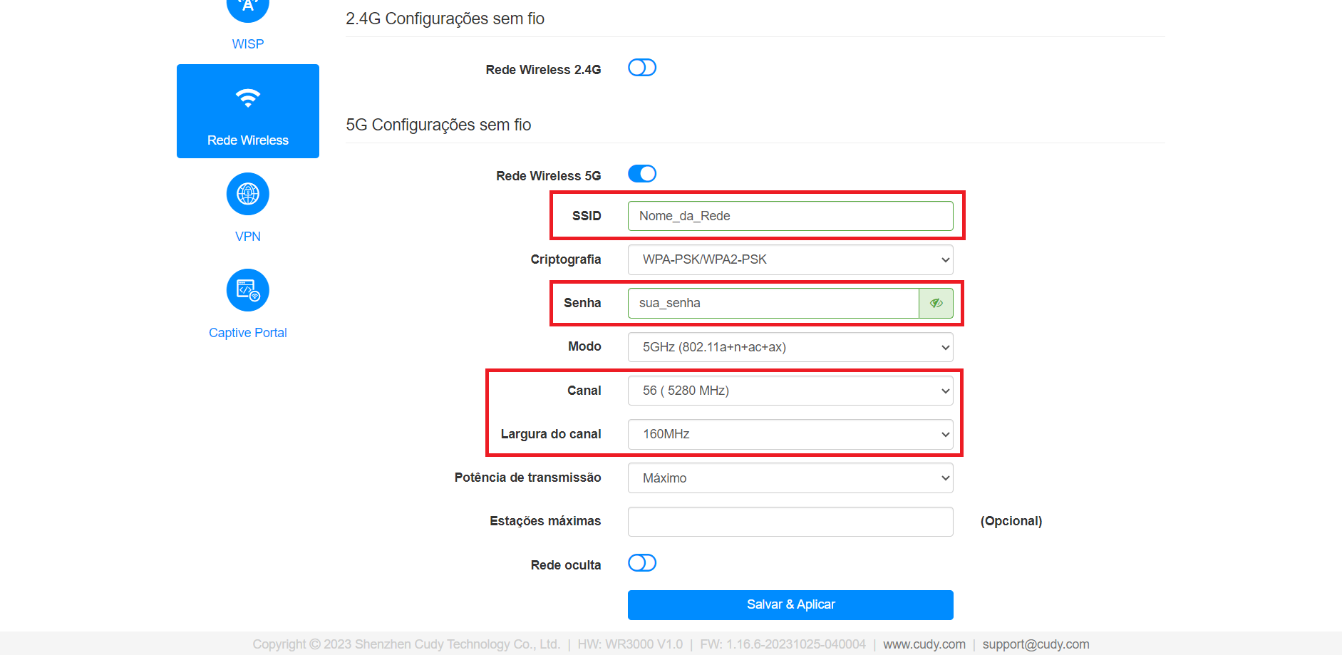 4. Após configurar os modos de rede escolhidos de forma individual, basta clicar no botão Salvar & Aplicar para salvar suas alterações.