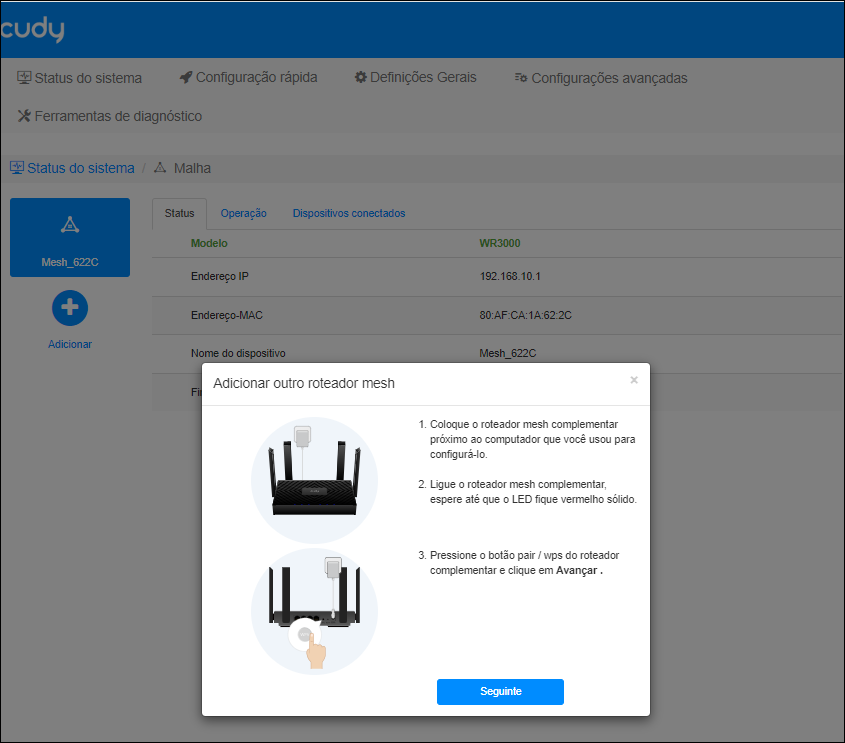 * Com o outro WR3000 já ligado, aperte o botão WPS fisico na parte traseira do WR3000 que será SATÉLITE.