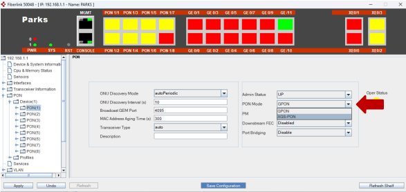 2. Expandir as opções referente à PON e em seguida expandir a opção Device(1) e selecione a PON que deseja alterar o modo.